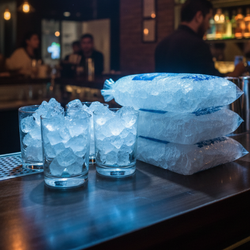 Hielo tipo rolito, cristalino y de alta pureza, ideal para bebidas, eventos, restaurantes y uso comercial.